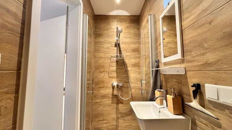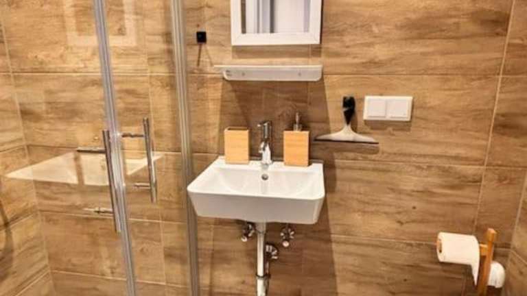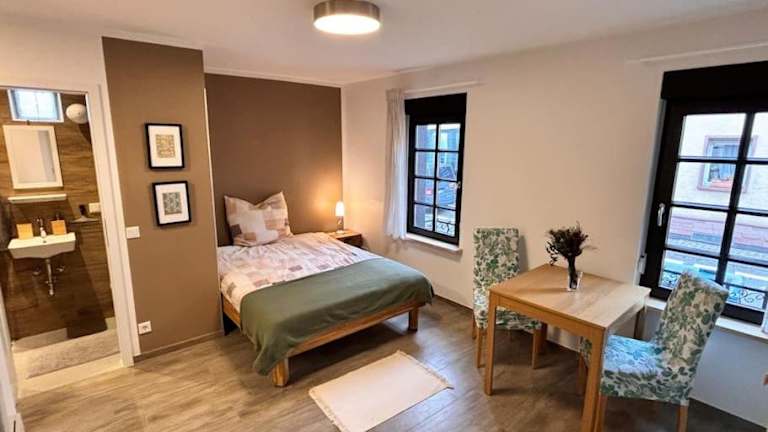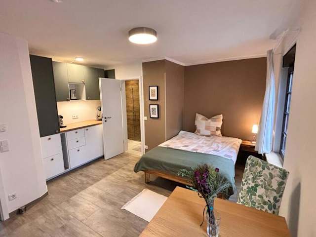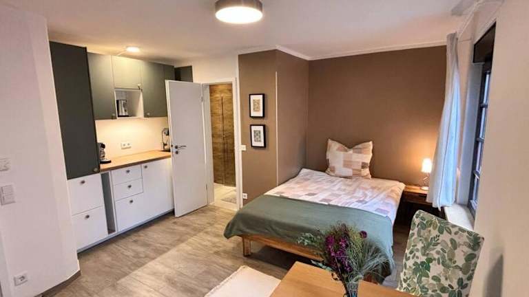 Die Ferienwohnung verfügt über ein Schlafzimmer sowie eine Küchenzeile, die mit einem Kühlschrank und einem Ofen ausgestattet ist. Ein TV und ein Sitzbereich sind ebenfalls vorhanden. Zudem gibt es ein Badezimmer mit einer Dusche. Handtücher und Bettwäsche werden in der Unterkunft bereitgestellt.