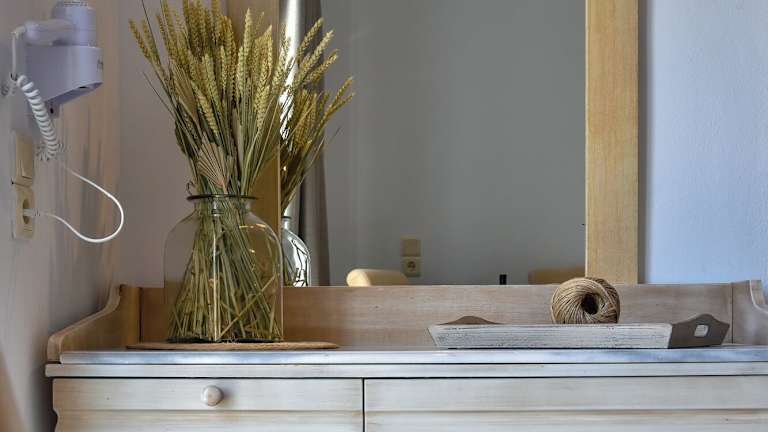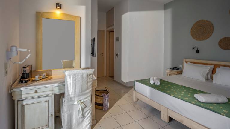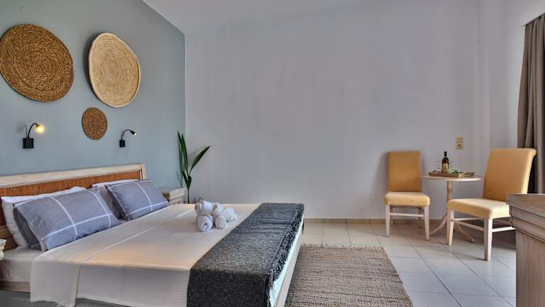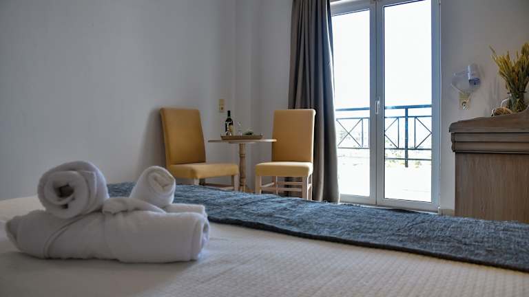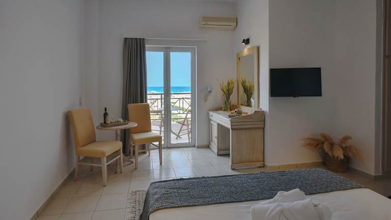 Die Zimmer sind mit Klimaanlage und Heizung ausgestattet und sorgen für ein angenehmes Raumklima. Gäste können den Meerblick von Balkon oder Terrasse geniessen. Die Zimmer verfügen über ein Doppelbett, und Kinderbetten sind ebenfalls vorhanden. Wertsachen können in einem Safe sicher aufbewahrt werden. Die Kochnische ist mit einer Tee-/Kaffeemaschine ausgerüstet. Zu den Annehmlichkeiten gehören auch ein Telefon, ein TV-Gerät und Wifi. Jedes Zimmer hat ein Badezimmer mit Dusche und Badewanne, und ein Haartrockner ist ebenfalls vorhanden. Das Hotel bietet Nichtraucherzimmer an.