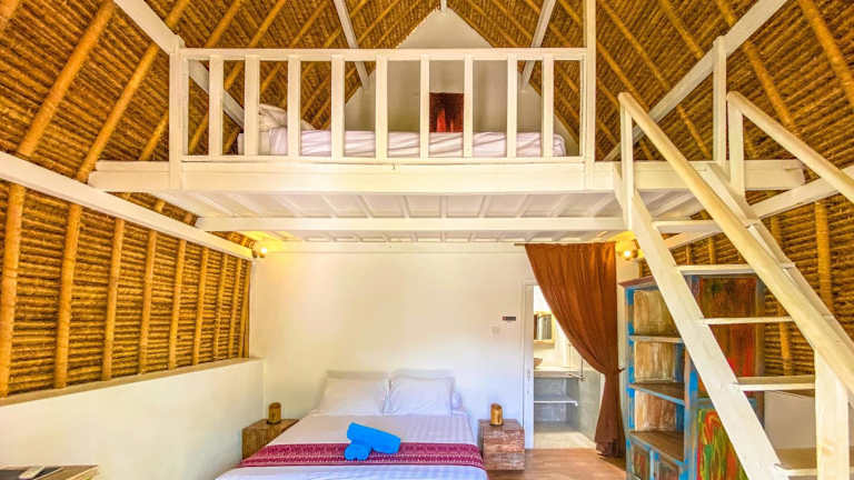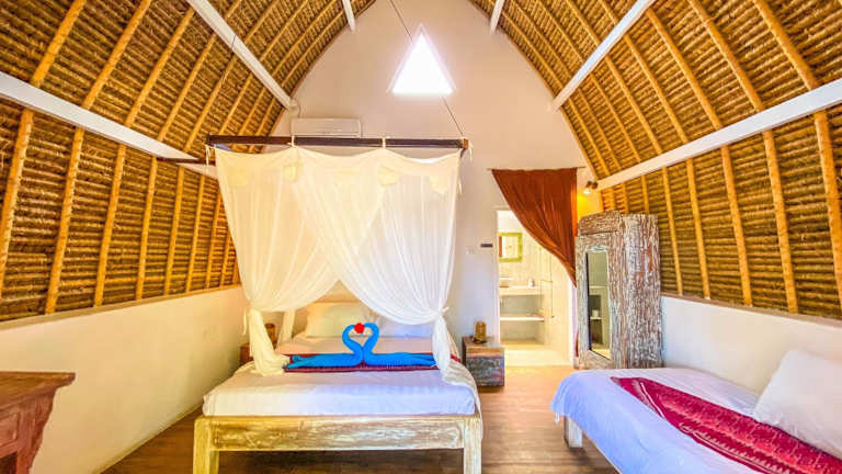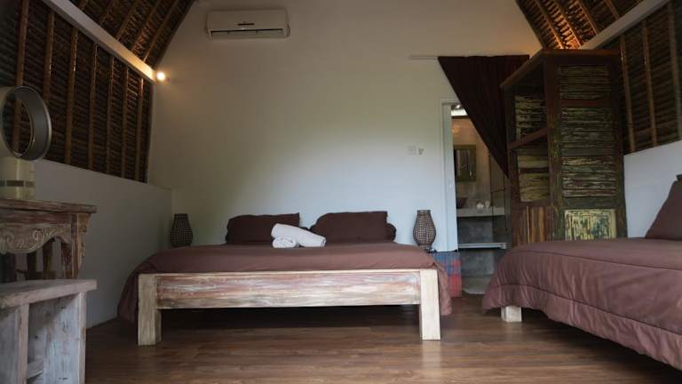 Die Bungalows sind geräumig und bieten eine Klimaanlage oder einen Ventilator. Zudem verfügen sie über eine eigene Terrasse mit Blick auf den Garten. Die Ausstattung umfasst einen Schreibtisch sowie ein eigenes Bad mit Dusche und Pflegeprodukten.