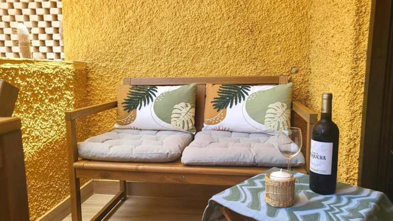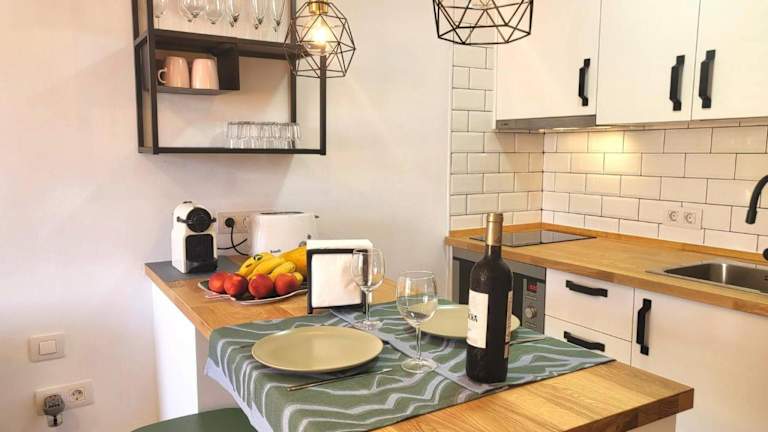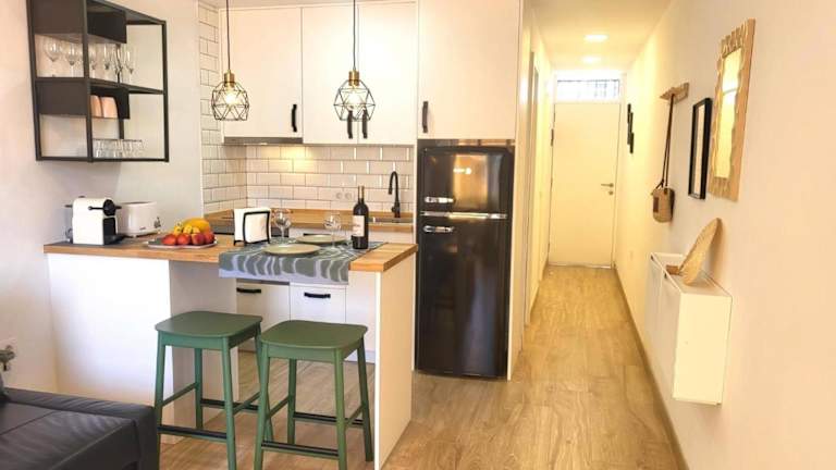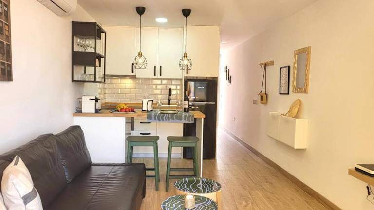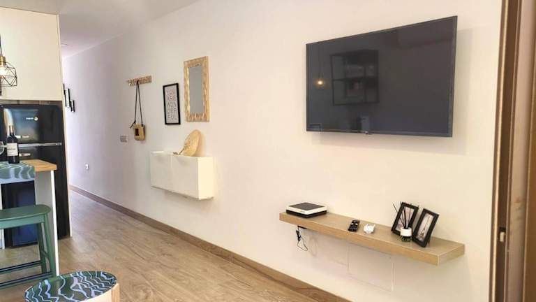 Die Ferienwohnung ist klimatisiert und besteht aus 1 Schlafzimmer, einem Wohnzimmer sowie einer voll ausgestatteten Küchenzeile mit Kühlschrank und Kaffeemaschine. Ein Badezimmer mit Bidet und Dusche ist ebenfalls vorhanden. Handtücher und Bettwäsche werden bereitgestellt. Der Balkon bietet zudem einen herrlichen Blick auf das Meer und die Berge.