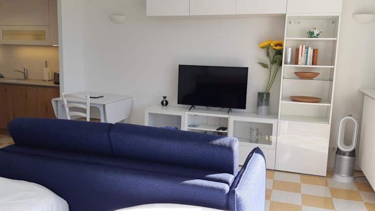 Das Studio umfasst ein Schlafzimmer und ein Wohnzimmer sowie einen Balkon mit Stadtblick. Es verfügt über einen Flachbild-TV, eine gut ausgestattete Küche mit Kühlschrank und Geschirrspüler sowie ein Badezimmer mit Dusche.