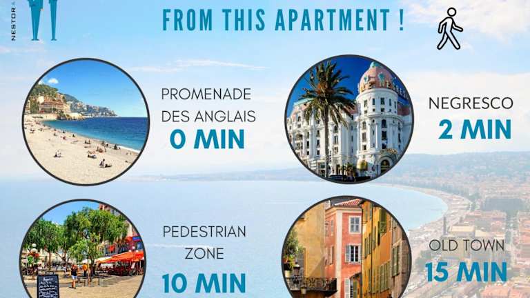 Die Unterkunft liegt sehr zentral, nur etwa 100 m vom Strand Plage du Forum entfernt. In der Nähe finden sich weitere interessante Orte wie der Strand Plage Voilier, der Strand Plage Florida sowie die Russisch-orthodoxe Kathedrale Saint-Nicolas. Der nächstgelegene Flughafen ist der Aéroport Nice Côte d’Azur, der sich nur 4 km entfernt befindet.