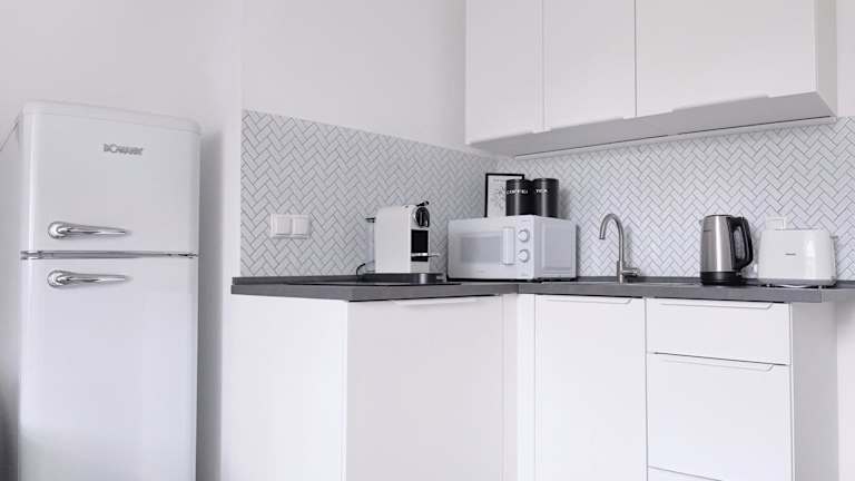 In jeder Wohneinheit steht eine voll ausgestattete Küche zur Verfügung, die mit Kühlschrank, Mikrowelle, Herdplatte, Kaffeemaschine und Wasserkocher ausgestattet ist. Ein Esstisch bietet Platz zum gemeinsamen Speisen.