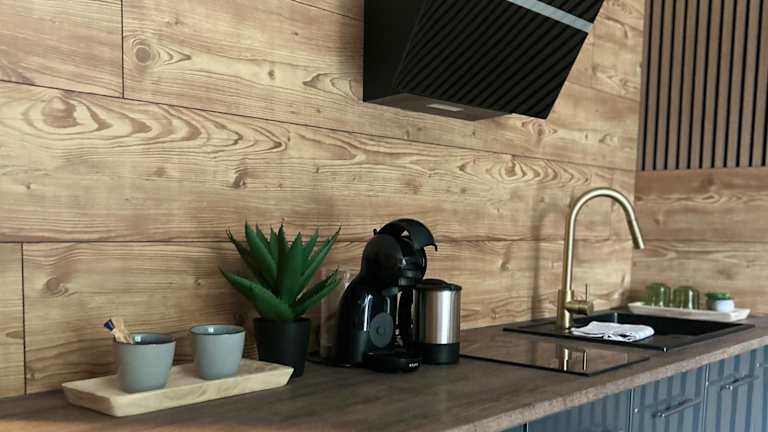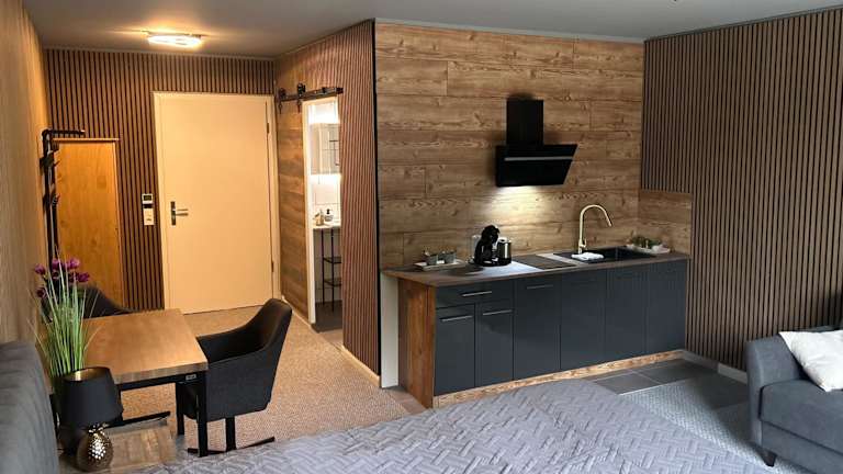 Die Unterkunft ist mit einer voll ausgestatteten Küche ausgestattet, welche eine Herdplatte und einen Wasserkocher beinhaltet.