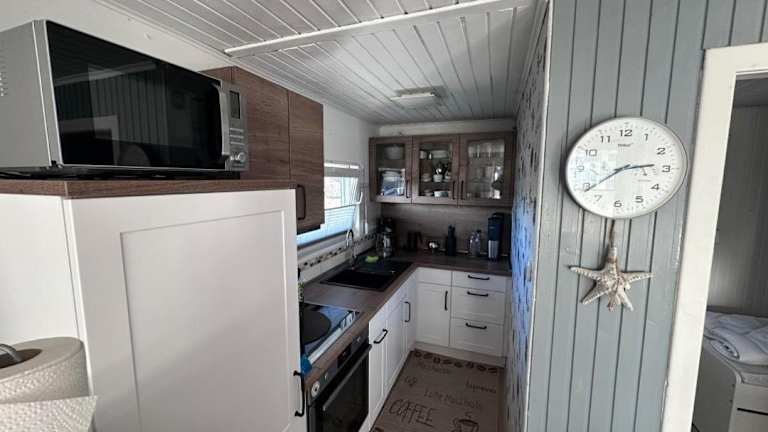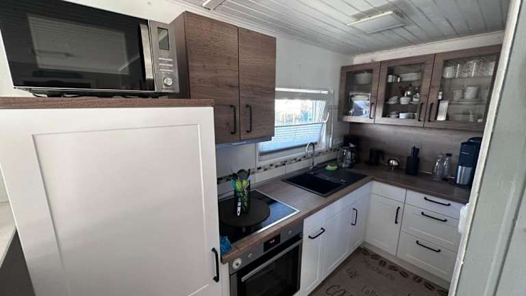 Die voll ausgestattete Küche des Ferienhauses ermöglicht es Gästen, selbst zu kochen. Es befindet sich ein Kühlschrank und eine Kaffeemaschine im Ferienhaus.