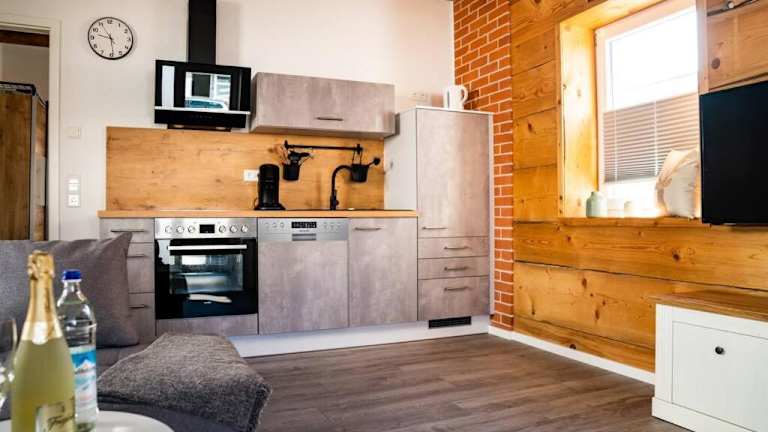 Es gibt ein Café vor Ort. Die Ferienwohnung verfügt über eine voll ausgestattete Küchenzeile mit Kühlschrank und Kaffeemaschine, sodass die Gäste eigenständig kochen können. Weitere Verpflegungsmöglichkeiten sind nicht erwähnt.