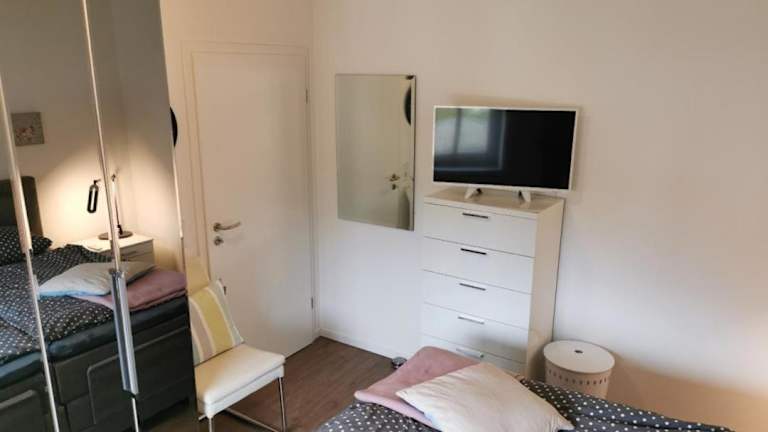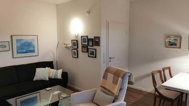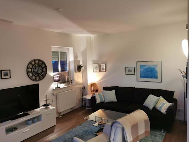 Die Ferienwohnung umfasst ein Schlafzimmer, ein Wohnzimmer und eine voll ausgestattete Küche mit Kühlschrank und Kaffeemaschine. Ein Badezimmer mit Dusche und Haartrockner ist ebenfalls vorhanden. Handtücher und Bettwäsche werden bereitgestellt.