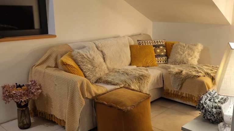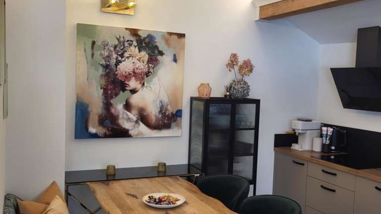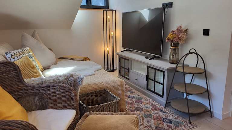 Die Ferienwohnung Angies Loft bietet ein separates Schlafzimmer, ein Wohnzimmer sowie eine voll ausgestattete Küche mit Kühlschrank. Ein Badezimmer ist ebenfalls vorhanden.