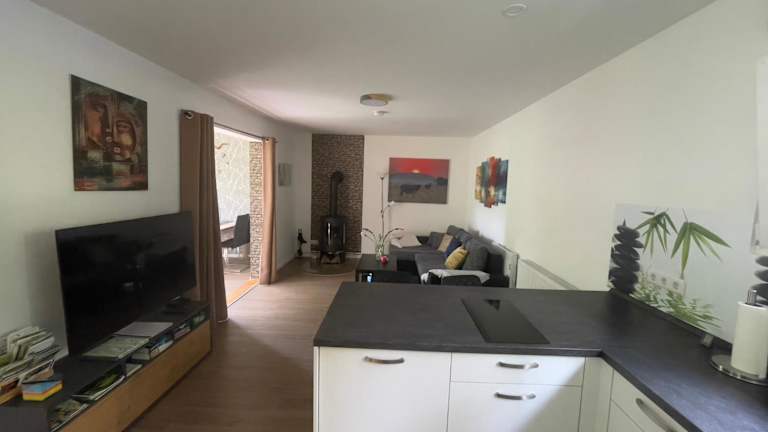 Das Ferienhaus umfasst ein Schlafzimmer und eine Küche, die mit einem Kühlschrank und einem Geschirrspüler ausgestattet ist. Es bietet ein Badezimmer mit Dusche, Haartrockner und Waschmaschine. Handtücher und Bettwäsche werden bereitgestellt.