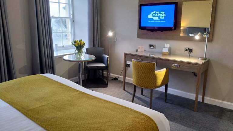 Das gastronomische Angebot umfasst ein Nichtraucherrestaurant mit Blick auf den Fluss Clyde, das traditionelle schottische Gerichte serviert. Gäste können sich auf ein reichhaltiges Frühstücksbuffet sowie ein Abendmenü freuen. Diätgerichte und Kindermenüs werden auf Anfrage zubereitet. Eine Bar ist ebenfalls im Hotel vorhanden, die eine gemütliche Atmosphäre für erfrischende Drinks bietet.