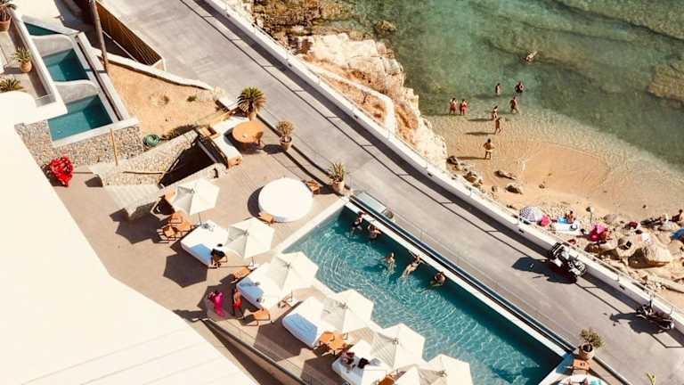 Das New Paradise Beach Resort ist ein Komplex aus Zimmern und Apartments mit Meerblick. Die Unterkünfte sind in weiss getünchten Gebäuden im kykladischen Stil untergebracht und zeichnen sich durch eine schlichte Einrichtung aus. Das Resort verfügt über einen hauseigenen Club, der für seine lebhaften Partys bekannt ist. Es werden verschiedene Dienstleistungen wie Gepäckaufbewahrung und Geldwechsel rund um die Uhr angeboten.