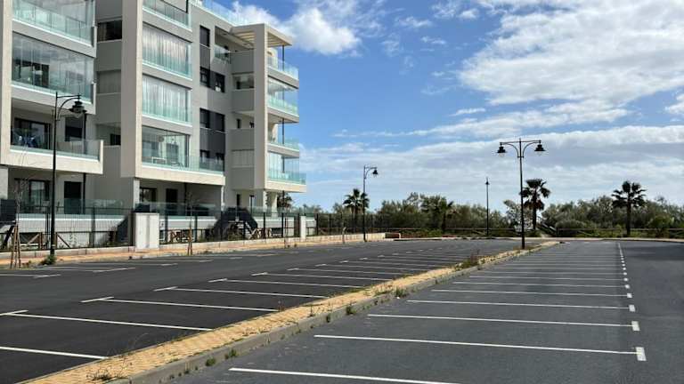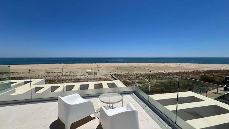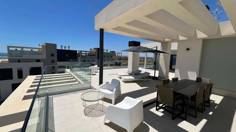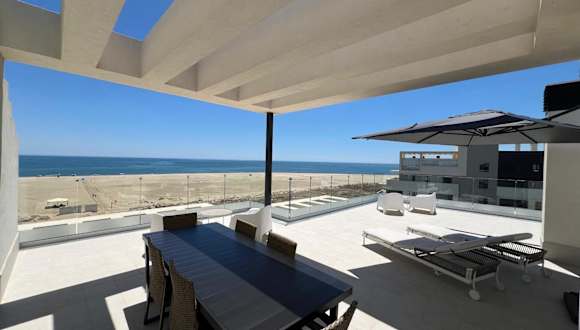 Die Ferienwohnung New penthouse with sunny beach view bietet Übernachtungsmöglichkeiten mit kostenlosem Wifi, Klimaanlage sowie einem saisonalen Aussenpool und einer Terrasse.