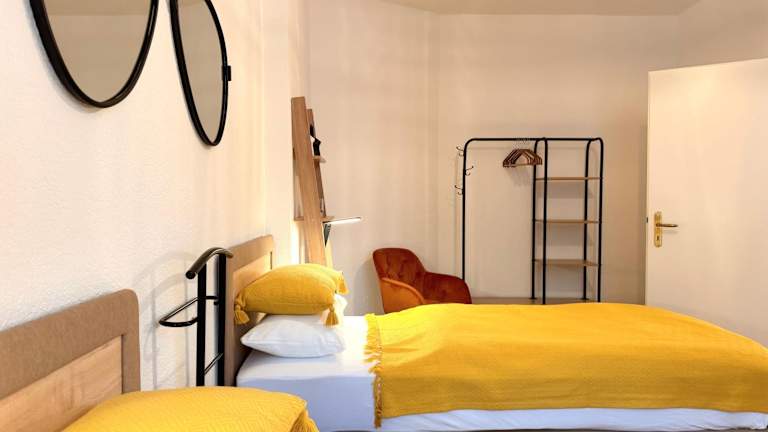 Die Ferienwohnung verfügt über zwei Schlafzimmer, ein Wohnzimmer, eine voll ausgestattete Küche mit Kühlschrank und Kaffeemaschine, sowie ein Badezimmer mit Dusche und Haartrockner. Handtücher und Bettwäsche werden bereitgestellt. In der Unterkunft sind Familienzimmer verfügbar und es wird ein Babybett für Kinder bis 3 Jahre angeboten.