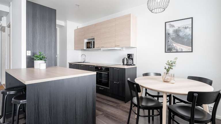 Die Ferienwohnung verfügt über ein Schlafzimmer, ein Wohnzimmer mit Flachbild-TV und Kabelkanälen. Die voll ausgestattete Küche beinhaltet einen Kühlschrank und Geschirrspüler. Zudem gibt es ein Badezimmer mit Dusche. Handtücher und Bettwäsche werden bereitgestellt.