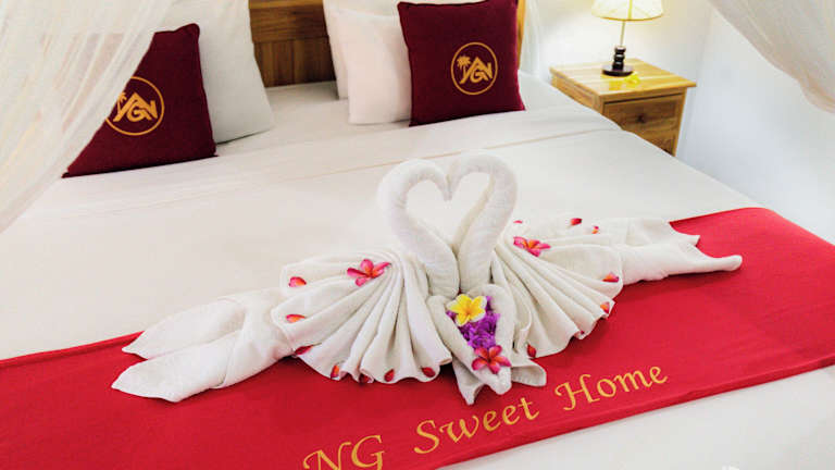 Das Frühstück wird à la carte und in asiatischen Varianten jeden Morgen im NG Sweet Home angeboten. Essenslieferung in die Unterkunft ist ebenfalls möglich, und das Restaurant bietet eine Auswahl an Gerichten für verschiedene Geschmäcker.