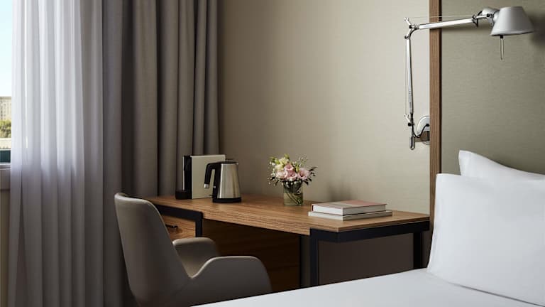 Die Zimmer sind mit einer Klimaanlage, individuell regulierbarer Heizung und Ventilator ausgestattet. Weitere Merkmale sind Balkon, Teppichboden, Doppelbett oder Sofabett, Safe, Minibar, Kühlschrank, Tee- und Kaffeemaschine sowie Schreibtisch. Ein Badezimmer mit Dusche und Badewanne ist ebenfalls vorhanden, einige Zimmer sind rollstuhlgerecht und bieten barrierefreie Badezimmer. Zudem stehen Familien-, Nichtraucher- und Raucherzimmer zur Verfügung.