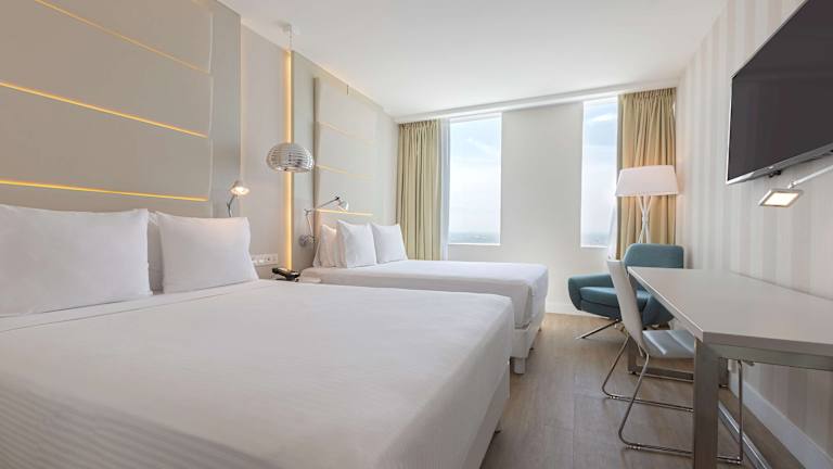 Die Zimmer sind klimatisiert und verfügen über eine komplette Ausstattung mit Doppel-, Queensize- oder Kingsize-Betten sowie einem Sofabett. Zu den Annehmlichkeiten gehören ein Fernseher, eine Minibar, ein Safe und eine Tee-/Kaffeemaschine. Jedes Zimmer hat ein eigenes Badezimmer mit Dusche und Badewanne. Familienzimmer sind ebenfalls erhältlich.