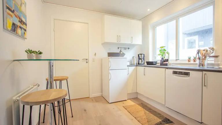 Die Unterkunft verfügt über eine voll ausgestattete Küche mit Kühlschrank und Kaffeemaschine, um sich selbstständig Verpflegung zuzubereiten.