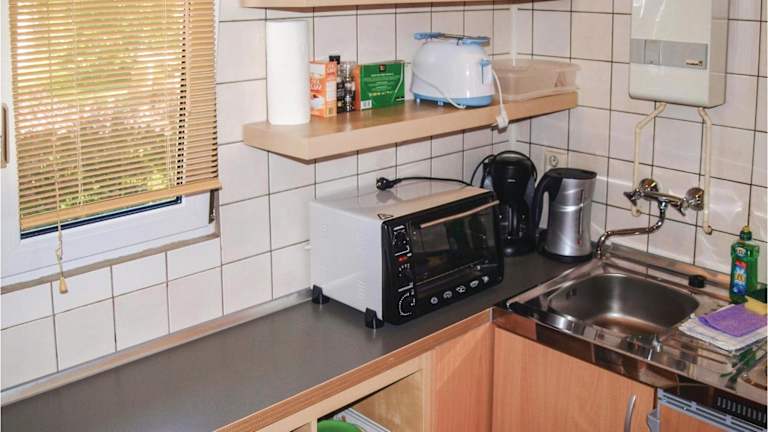 Die Unterkunft umfasst eine voll ausgestattete Küche mit Kühlschrank, die den Gästen ermöglicht, ihre eigenen Mahlzeiten zubereiten zu können.