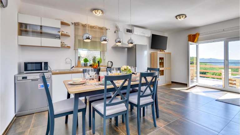 Das Ferienhaus verfügt über drei Schlafzimmer, einen Flachbild-TV sowie eine voll ausgestattete Küche mit Kühlschrank und Geschirrspüler. Die Unterkunft ist klimatisiert und bietet einen heimeligen Rückzugsort.