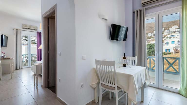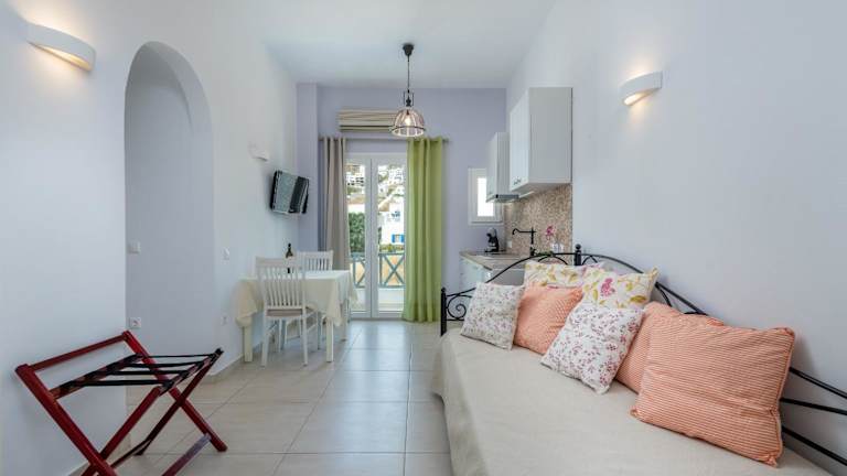 Die klimatisierten Wohneinheiten im Niriides Luxury Studios verfügen über Fliesenböden, ein eigenes Badezimmer, einen Flachbild-TV, einen Schreibtisch, eine ausgestattete Küchenzeile sowie einen Balkon mit Stadtblick. Allergikerfreundliche Zimmer sind verfügbar und die Unterkünfte sind schallisoliert.