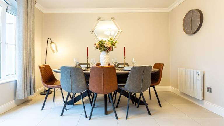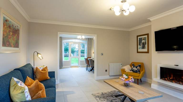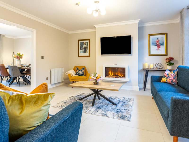 Das Ferienhaus verfügt über eine voll ausgestattete Küche mit Geschirrspüler, Waschmaschine/Trockner und Essbereich. In der Lounge finden Gäste ein Sofa, einen Kamin und einen Flachbild-Kabel-TV mit einem CD-/DVD-Player.