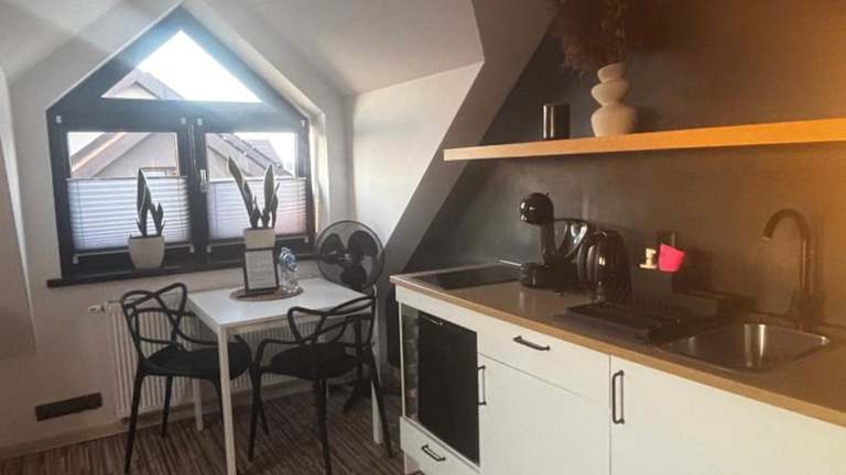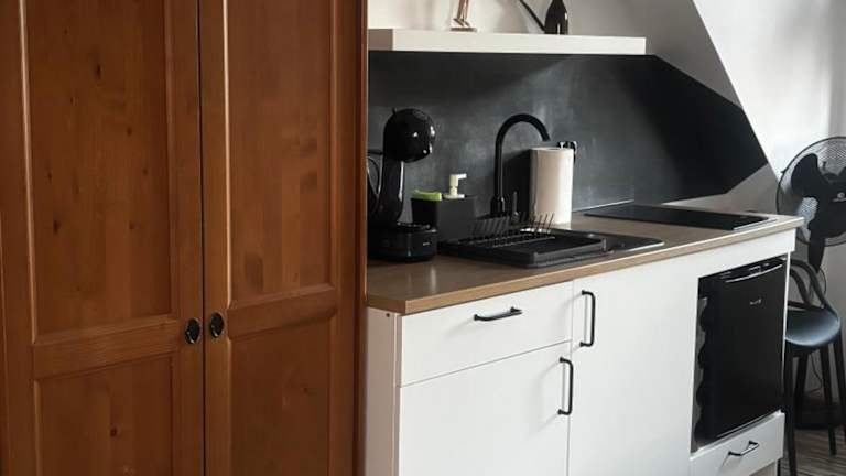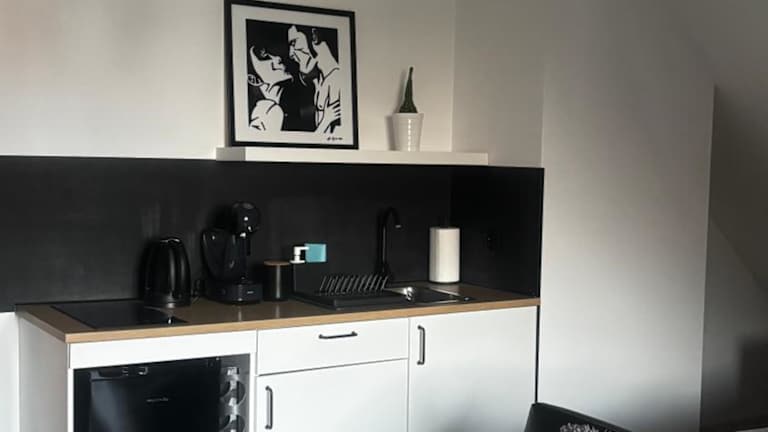 Die Unterkunft verfügt über eine voll ausgestattete Küchenzeile mit Kühlschrank, Kaffeemaschine und Herdplatte. Zusätzliche Verpflegungsmöglichkeiten sind nicht angegeben.