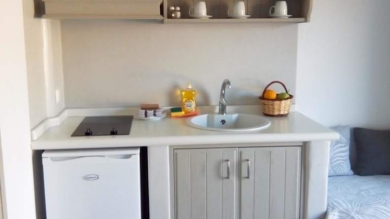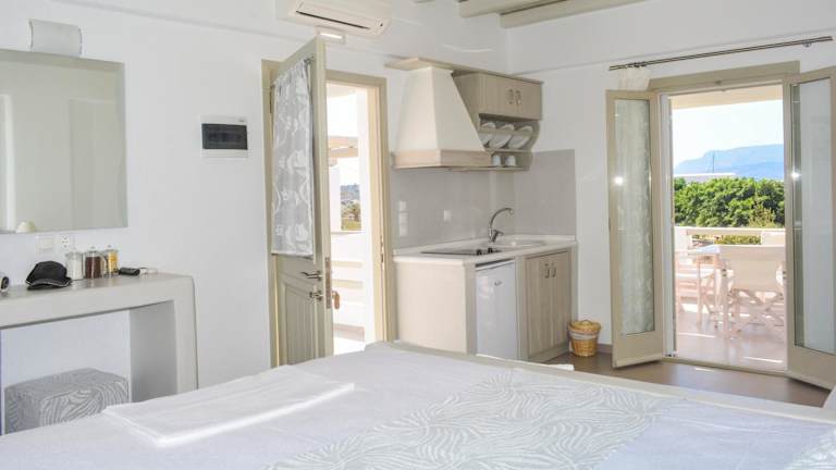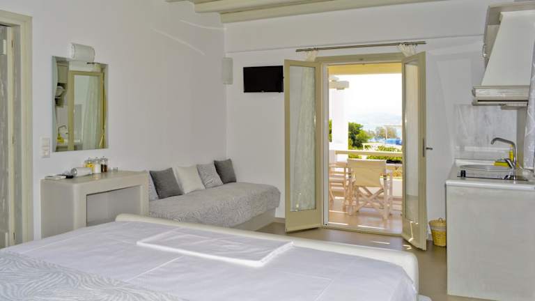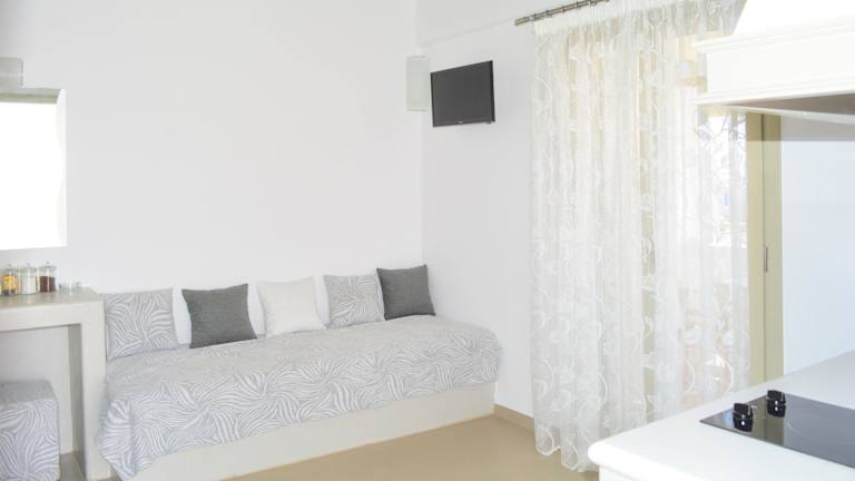 Die Zimmer der Notos Studios sind gut ausgestattet und verfügen über einen Kleiderschrank, eine Kaffeemaschine, einen Kühlschrank, eine Herdplatte, einen Safe, einen Flachbild-TV, eine Terrasse sowie ein eigenes Badezimmer mit Dusche. Alle Zimmer sind mit Wasser- und Handtüchern ausgestattet und bieten einen Balkon, wobei einige Zimmer einen Blick auf das Meer gewähren.