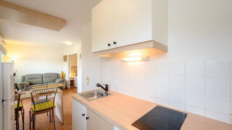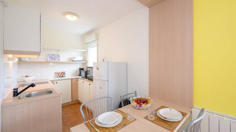 Die Ferienwohnung ist mit einer voll ausgestatteten Küche ausgestattet, die einen Kühlschrank und einen Wasserkocher umfasst.