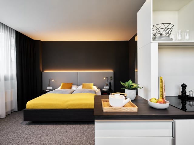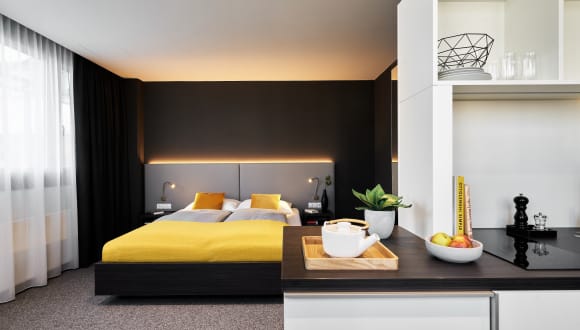 Tür auf, rein kommen, lächelnd nicken: Das kannst Du für eine Zeit ein Zuhause nennen. Unsere Apartments mit bequemen Bett, wohnlichem Sitz- und Arbeitsbereich, mit komfortablen Design-Mobiliar, einer Kitchenette, in der Du Deine Lieblingspasta zubereiten kannst und ein moderner TV, in dem Du Dich durch Deine Lieblingssender zappen kannst. Dein Badezimmer hat eine begehbare Dusche und große Spiegelflächen am Waschtisch. Einfach alles, um Dich morgens frisch raus in die Welt und abends perfekt ins Bett zu bringen. JOYN in.
