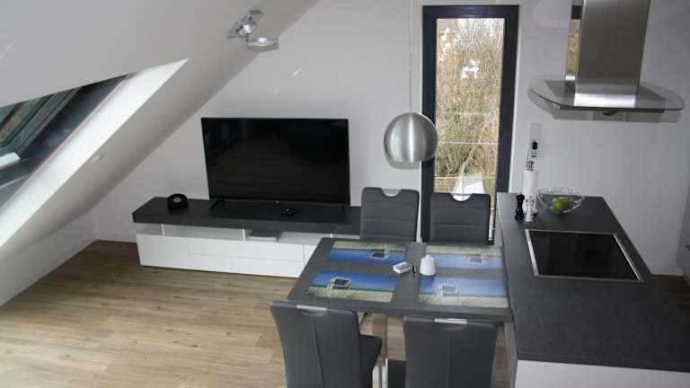 Die Ferienwohnung verfügt über ein Schlafzimmer, ein Wohnzimmer, einen Flachbild-TV sowie eine gut ausgestattete Küche mit Kühlschrank und Geschirrspüler. Zudem gibt es ein Badezimmer mit Dusche. Handtücher und Bettwäsche werden bereitgestellt.