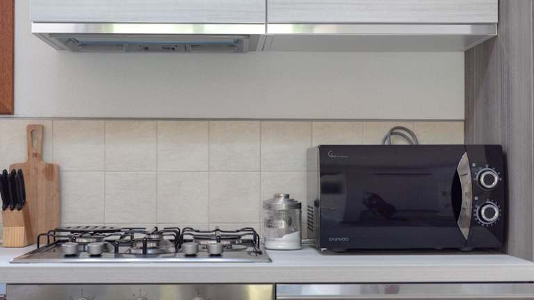 Die voll ausgestattete Küche umfasst einen Kühlschrank und eine Kaffeemaschine, sodass die Gäste ihre eigenen Mahlzeiten zubereiten können. Zudem steht ein Grill zur Verfügung, um unter freiem Himmel zu kochen.