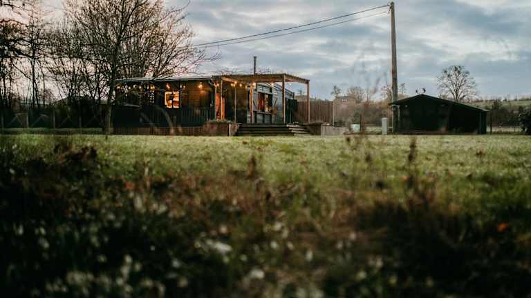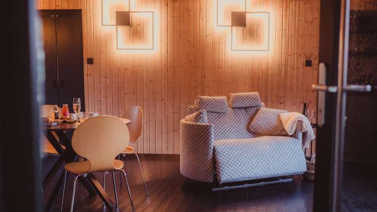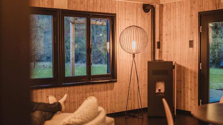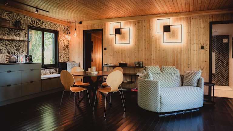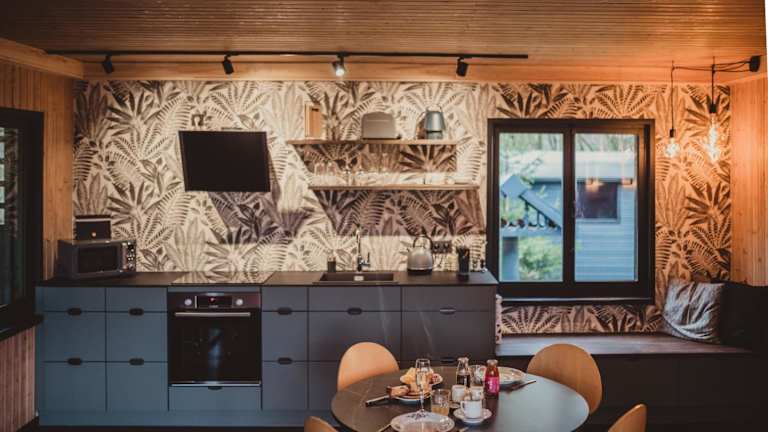 Die Chalet-Ausstattung umfasst ein Schlafzimmer sowie eine Küche mit Kühlschrank, Geschirrspüler und Kaffeemaschine. Handtücher und Bettwäsche werden bereitgestellt.