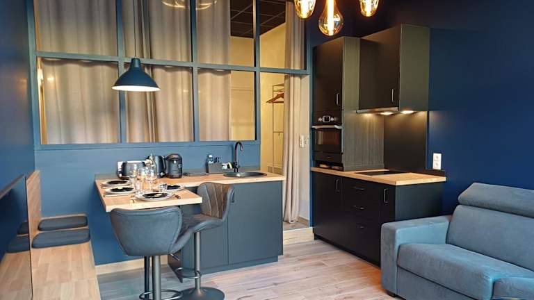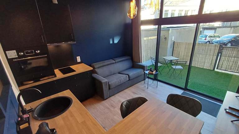 Die Loftwohnung beinhaltet ein Schlafzimmer, ein Wohnzimmer mit Flachbild-TV, eine gut ausgestattete Küche mit Kühlschrank und Geschirrspüler sowie ein Badezimmer mit Dusche. Die Terrasse bietet einen Gartenblick. Handtücher und Bettwäsche werden bereitgestellt.