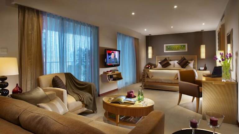 Die Zimmer sind klimatisiert und bieten ein angenehmes Raumklima. Sie verfügen über einen Balkon oder eine Terrasse mit Stadtblick, ein Kingsizebett und ein Sofabett. Zudem sind separate Schlafzimmer und Zustellbetten verfügbar. Zu den Annehmlichkeiten gehören ein Safe, eine Minibar, ein Schreibtisch sowie eine komplett ausgestattete Kochnische mit Kühlschrank, Herd, Mikrowelle, Geschirrspüler und Backofen. Ein TV-Gerät, ein Radio, eine Stereoanlage, ein CD- und DVD-Player sowie kostenfreies WiFi sorgen für zusätzlichen Komfort. Die Badezimmer sind mit einer Dusche und einer Badewanne ausgestattet und bieten Haartrockner sowie Bademäntel.