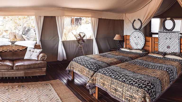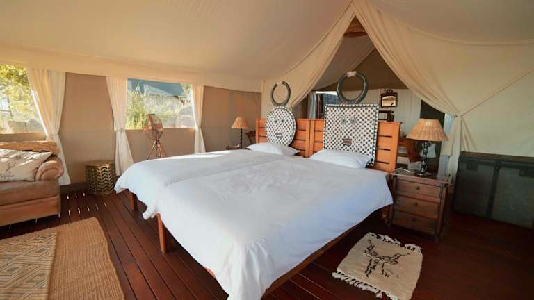 Die Unterkunft verfügt über 5 Zelten, die als Nichraucherzimmer ausgelegt sind. Jedes Zelt bietet einen Blick auf die Landschaft und verfügt über eine Terrasse mit Liegestühlen. Zur Ausstattung gehören ein Moskitonetz, ein Safe, ein Deckenventilator, ein Kühlschrank, eine Nespressomaschine sowie ein WLAN/WiFi Zugang. Des Weiteren sind die Zimmer mit einer Dusche (inklusive Aussendusche), WC, einem Bademantel, Slipper, Föhn und einem Reinigungsservice ausgestattet.