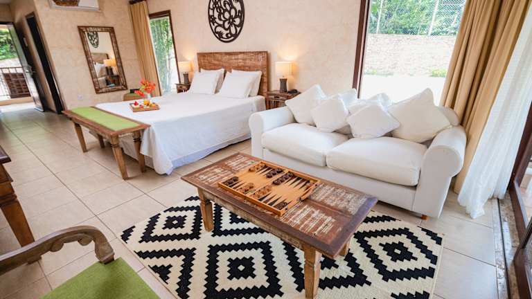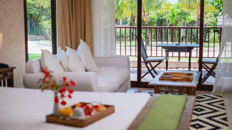 Die Zimmer sind mit einer Klimaanlage, Sat-TV und einem geräumigen Balkon mit Garten- oder Meerblick ausgestattet. Zu den weiteren Annehmlichkeiten zählen ein Safe, eine Minibar, ein Schreibtisch, eine Mikrowelle sowie ein Telefon und WLAN. Im Badezimmer stehen eine Dusche, eine Badewanne, ein Haartrockner und Bademäntel zur Verfügung. Das Hotel bietet zudem Familien- und Nichtraucherzimmer.