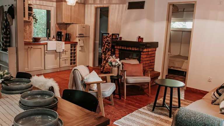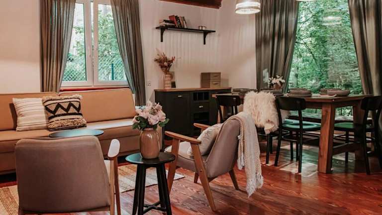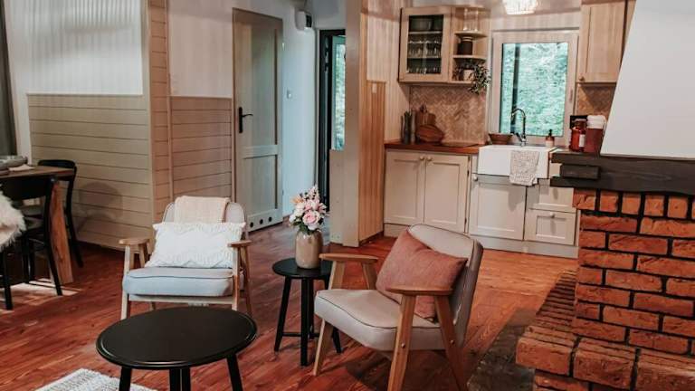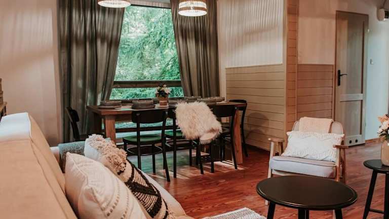 Das Chalet Okno na las verfügt über einen Garten und eine Terrasse mit Blick auf den Fluss. Es bietet eine gemütliche Atmosphäre und private Einrichtungen für die Gäste. Die Unterkunft ist ideal für Familien oder Gruppen, die eine ruhige Ferienzeit in der Natur verbringen möchten.