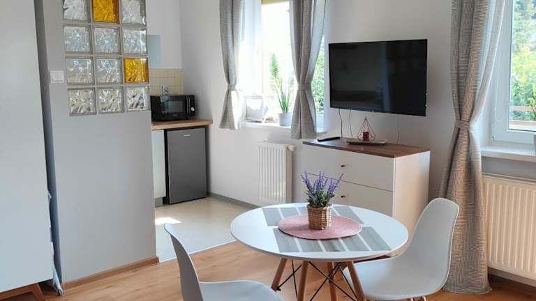 Das Apartment im OLLY Apartament CIECHOCINEK verfügt über einen gemütlichen Wohnbereich mit einem Flachbild-TV und Zugang zu einem Balkon. Die Küche ist gut ausgestattet mit einem Kühlschrank, einer Mikrowelle und einem Kochfeld, so dass Sie Ihre eigenen Mahlzeiten zubereiten können. Im Badezimmer finden Sie eine Badewanne oder Dusche sowie kostenfreie Pflegeprodukte und einen Haartrockner. Kostenloses WLAN steht Ihnen im gesamten Apartment zur Verfügung.