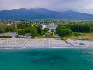 Vor dem Panorama des Berges Olymp und eingebettet in die herrliche Umgebung befindet sich der neu gestaltete Komplex "The Olympian Bay Bungalows". Die mit internationalem Clubcharakter gehörenden Bungalows liegen in den ersten beiden Bungalowreihen zum Meer, und bieten viel Ruhe und Erholung im üppig angelegten Gartenbereich (nur für Gäste ab 14 Jahren der Olympian Bay Bungalows vorgesehen), gleichzeitig können die umfangreichen Annehmlichkeiten des großen Ferienhotels mit genutzt werden. Eine ideale Kombination für Paare und Singles auf der Suche nach einer entspannten Unterkunft, ohne Verzicht auf das Angebot eines Club Hotels. Der lange Sand-/Kiesstrand von Leptokaria Pieria liegt direkt vor dem Hotel und lädt zu ausgedehnten Spaziergängen ein. In nur 10 Gehminuten erreichen Sie das Zentrum des Dorfes mit Einkaufsmöglichkeiten, Tavernen und Bars. Die Stadt Litochoro ist 8 km entfernt, den Flughafen erreichen Sie nach etwa 120 km.
