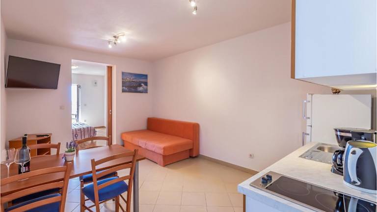 Die Wohnung umfasst ein Schlafzimmer, ein Wohnzimmer sowie ein Badezimmer mit Dusche. Durch die sorgfältige Einrichtung wird ein heimeliges Ambiente geschaffen, ideal für einen erholsamen Aufenthalt.