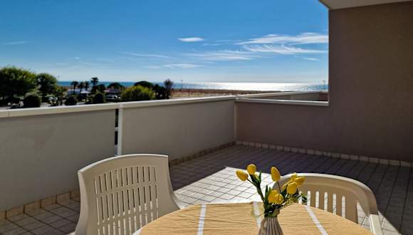 Die Ferienwohnung umfasst ein Schlafzimmer und ein Wohnzimmer mit einem TV. Die gut ausgestattete Küche ist mit einem Kühlschrank und einer Mikrowelle versehen. Zudem verfügt die Unterkunft über ein Badezimmer mit einem Bidet. Ein Balkon mit Meerblick rundet das Angebot der Ferienwohnung ab.