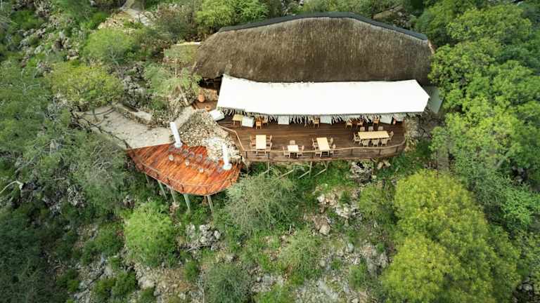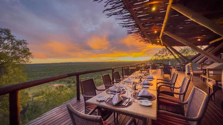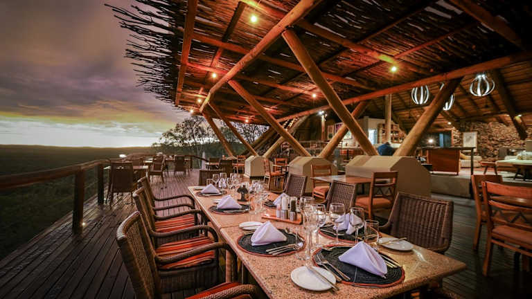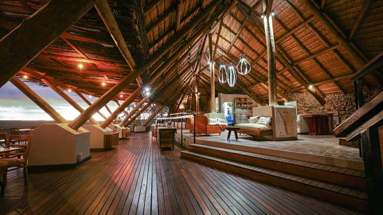Im Hauptspeisesaal der Ongava Lodge können Sie Ihre Mahlzeiten genießen. Das Restaurant befindet sich unter einem Reetdach und bietet einen einzigartigen Blick auf die Sterne. Hier können Sie köstliche Gerichte aus der regionalen Küche genießen.