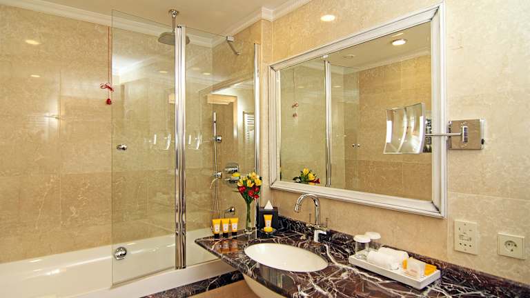 Die klimatisierten Zimmer sind mit einem Flachbild-Sat-TV, einem Safe, einer Tee-/Kaffeemaschine und einem eigenen Bad ausgestattet, das eine Dusche sowie eine Badewanne bietet. Die Zimmer sind zusätzlich mit Hausschuhe, Bademäntel sowie kostenfreien Pflegeprodukten eingerichtet. Das Hotel bietet auch rollstuhlgerechte Zimmer und Familien-, Nichtraucher- und Raucherzimmer an.