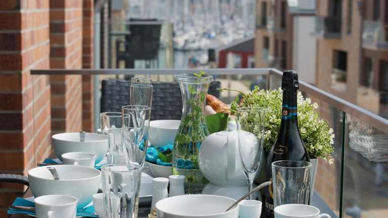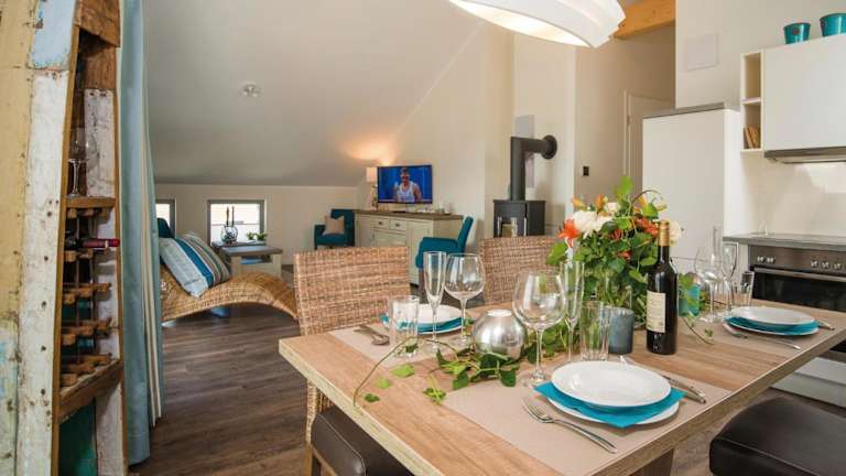 Die Ferienwohnung verfügt über eine Küchenzeile, die mit einem Kühlschrank, Geschirrspüler, Ofen, Kaffeemaschine und Wasserkocher ausgestattet ist. Verpflegungsmöglichkeiten sind keine weiteren angegeben.