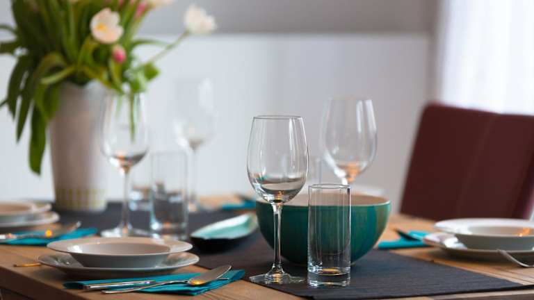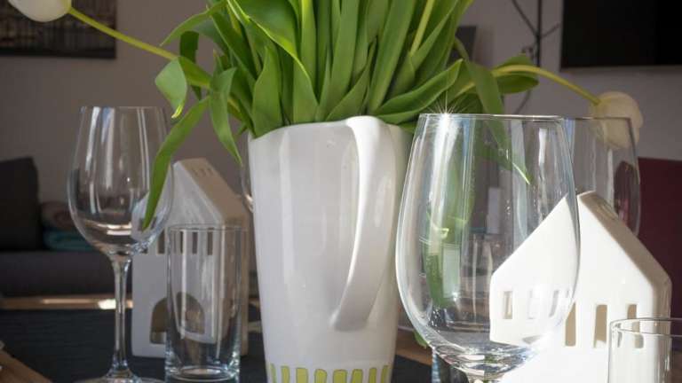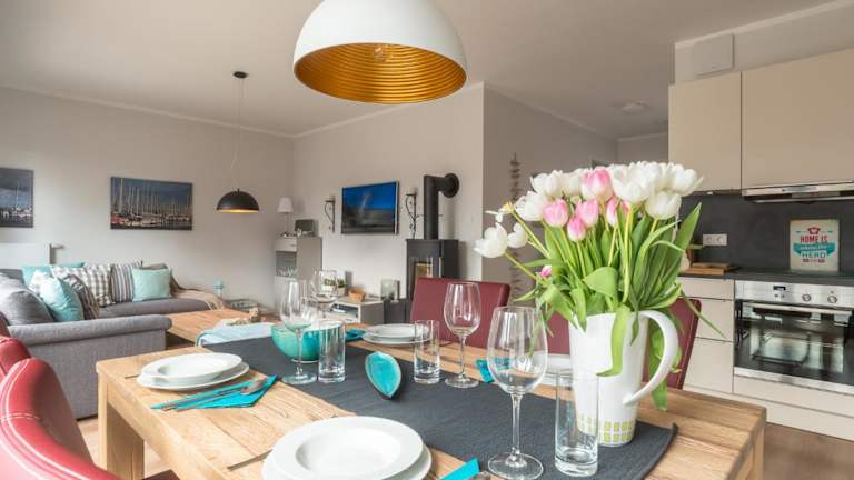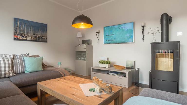 Die Ferienwohnung ist ausgestattet mit einem TV sowie einer Küchenzeile, die einen Kühlschrank, Geschirrspüler, Ofen, Kaffeemaschine und Wasserkocher beinhaltet.
