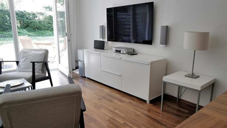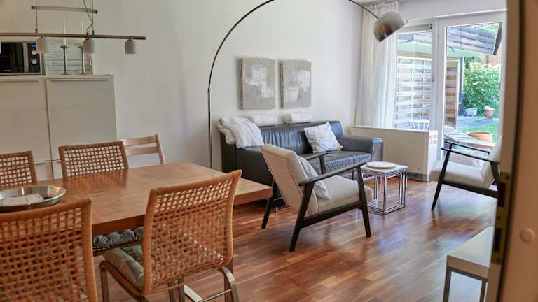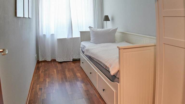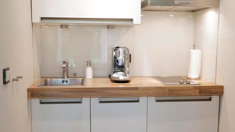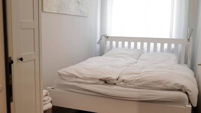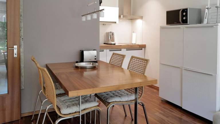 Die Ferienwohnung verfügt über 1 Schlafzimmer und eine Küchenzeile, die mit einem Kühlschrank, Geschirrspüler und Kaffeemaschine ausgestattet ist.