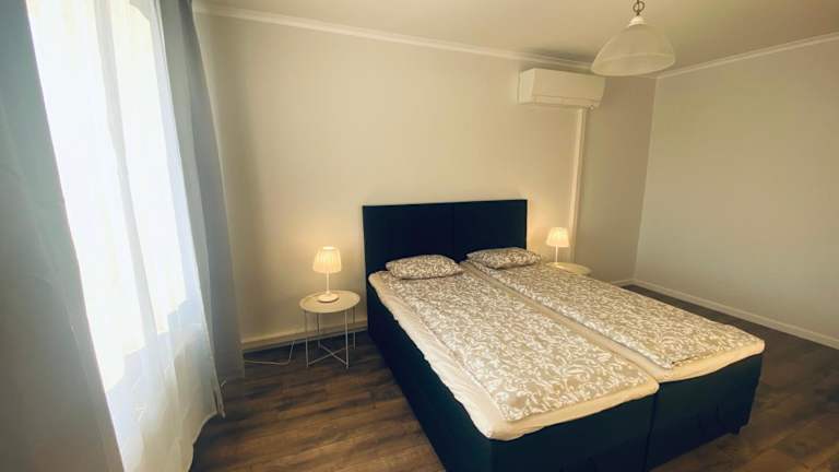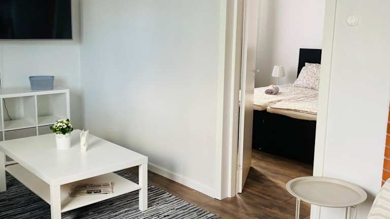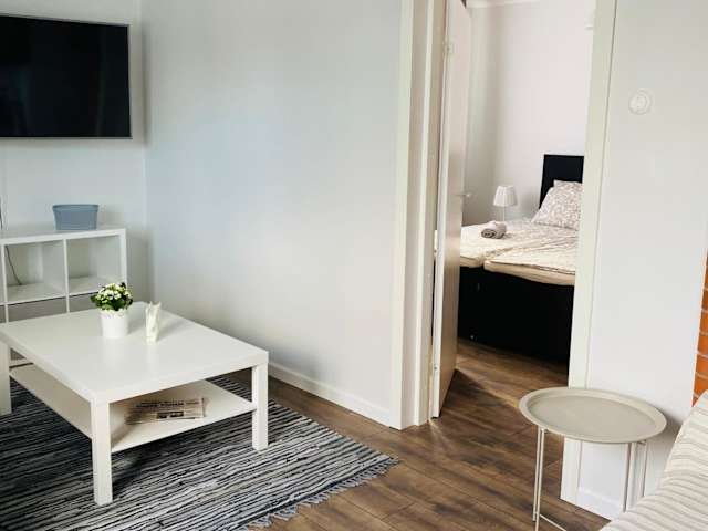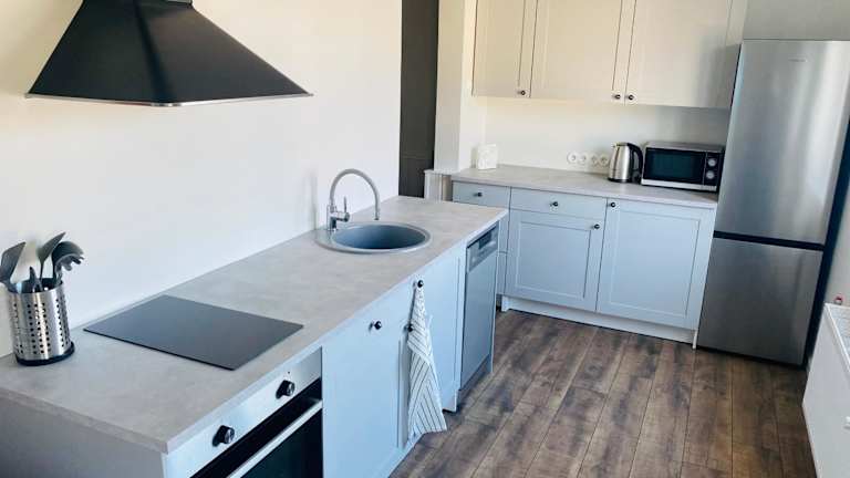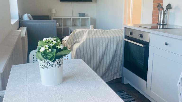 Die Ferienwohnung umfasst ein Schlafzimmer und eine Küchenzeile, ausgestattet mit einem Kühlschrank und einem Geschirrspüler. Es steht ein Badezimmer mit Dusche, Haartrockner und Waschmaschine zur Verfügung. Handtücher und Bettwäsche werden bereitgestellt.