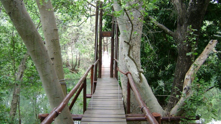 Die Lodge liegt auf einer Insel und wird über eine Hängebrücke erreicht.