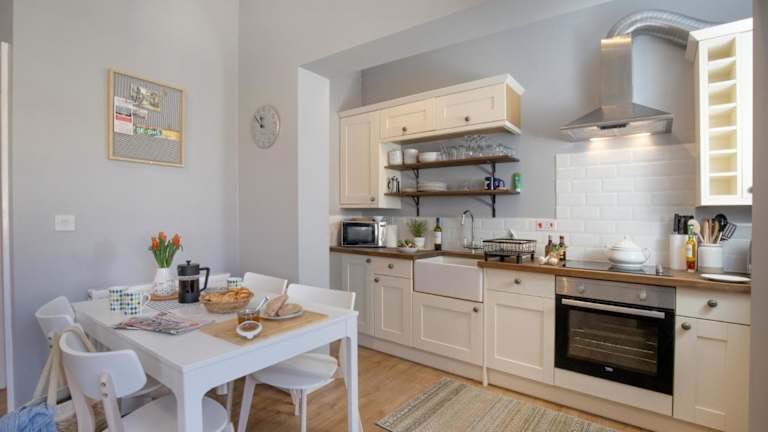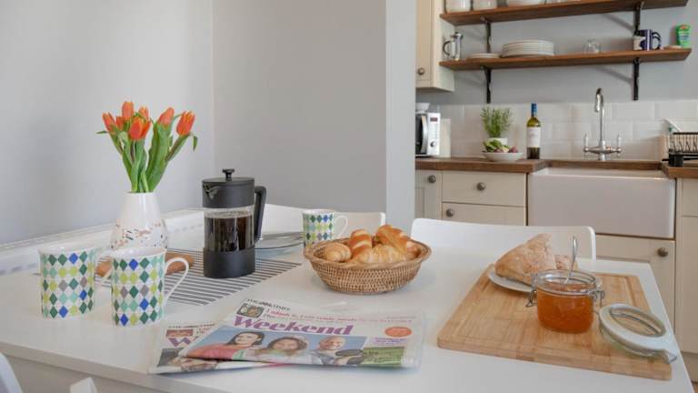 Die Ferienwohnung umfasst zwei Schlafzimmer sowie eine gut ausgestattete Küche, die mit einem Kühlschrank und einem Geschirrspüler ausgestattet ist. Weiterhin stehen zwei Badezimmer mit einer Dusche, Haartrockner und Waschmaschine zur Verfügung. Handtücher und Bettwäsche werden bereitgestellt.